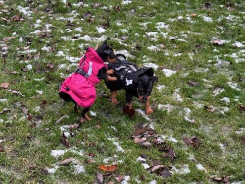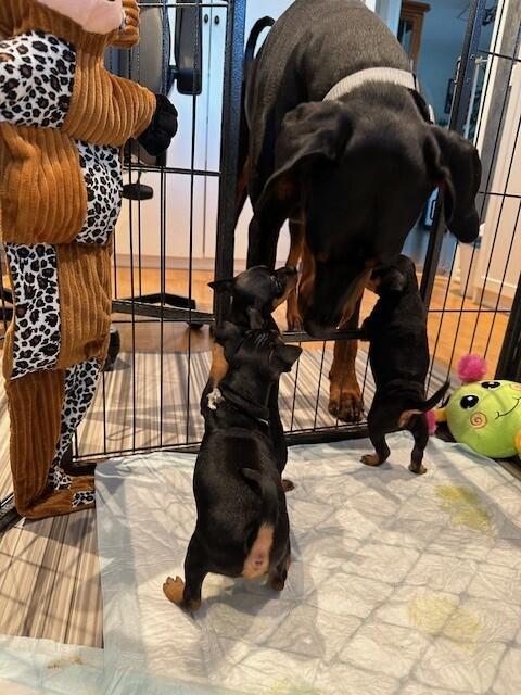 Hörru, varför e du så stor? Zara inspekterar valparna.